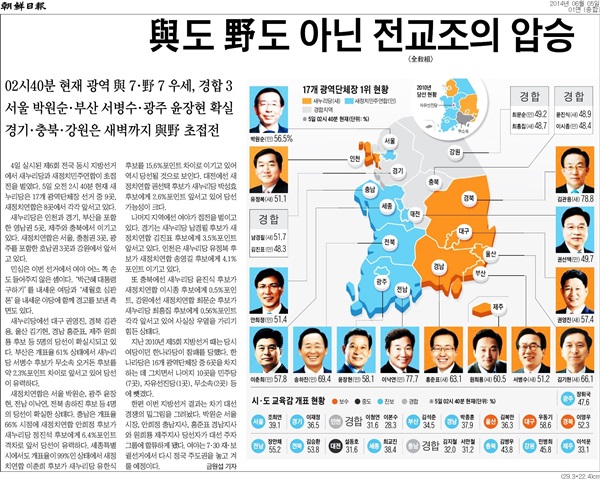 조선의 이날 1면 제목은 ‘여도 야도 아닌 전교조의 압승’. 17개 광역단체장 선거에서 여야가 치열한 접전을 벌이는 가운데 시·도교육감 선거에서는 진보진영 후보들이 대약진을 거뒀기 때문이다.