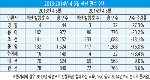 본보가 올해 4,5월 경향신문 동아일보 조선일보 중앙일보 한겨레 매일경제 한국경제 등 주요 신문사의 섹션 면수를 조사한 결과, 지난해 같은 기간보다 6~80%가량 축소된 것으로 확인됐다.