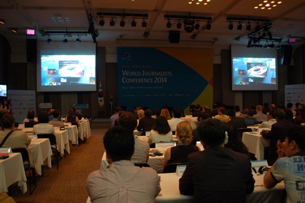 이날 오전 10시 서울 중구 한국프레스센터 20층 국제회의장에서 열린 세계기자대회 개막식에 참석한 100여명의 외국기자와 국내 외신기자, 한국 기자들은 선언문 채택에 만장일치로 박수를 보냈다.
