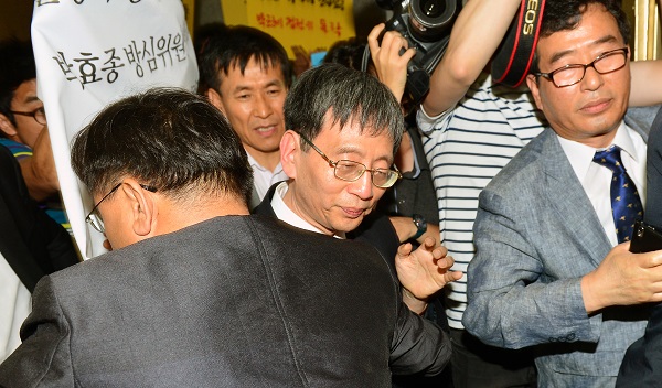 ▲ 박근혜 대통령의 대선 캠프 출신으로 5.16 쿠데타를 혁명으로 미화하는 등 뉴라이트 역사관으로 논란을 빚은 박효종 신임 방송통신심의위원회 위원장이 17일 오후 서울 양천구 목동 방송회관에서 박 신임 위원장의 사퇴를 촉구하는 언론노조 및 시민단체 관계자들의 항의를 받으며 취임식장으로 들어서고 있다. (뉴시스) |