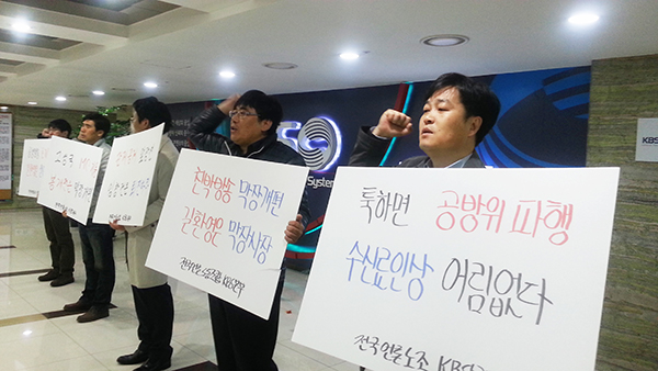 ▲ 전국언론노조 KBS본부가 3월24일 KBS본관 1층에서 라디오 봄개편 관련 공정방송위원회 파행에 대해 사측에 항의하는 피켓팅을 벌이고 있다. (사진=KBS본부) |