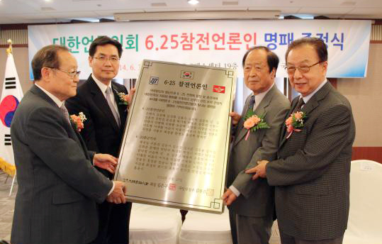 대한언론인회는 지난달 30일 국방부 후원으로 6·25 참전언론인 및 종군기자 77명의 이름을 새긴 대형 명패를 서울 중구 한국프레스센터에 현창했다. 사진 왼쪽부터 김은구 대한언론인회장, 김민석 국방부 대변인, 박기병 6·25참전언론인회장, 한영섭 6·25종군기자동우회장. (사진=대한언론인회)