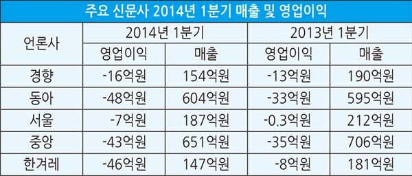 이 같은 우려는 주요 신문사들이 지난 5월에 발표한 1분기 영업실적에 고스란히 나타났다. 금감원 전자공시 시스템에 따르면 동아일보, 중앙일보, 서울신문, 한겨레 등 주요 신문사들의 1분기 영업적자 폭이 작년 같은 기간보다 22% 이상 늘었다.