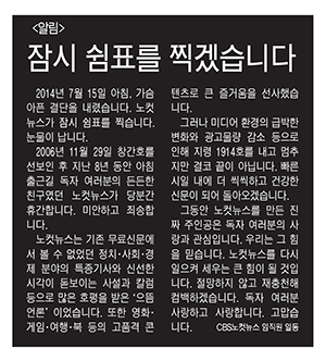 ▲ 데일리노컷뉴스의 휴간을 알리는 지난 15일자 1면 사고. |