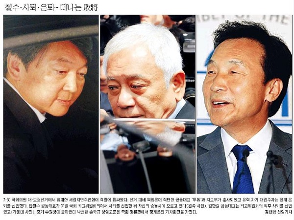 국민일보는 ‘철수·사퇴·은퇴…떠나는 敗將’이라는 제목의 사진을 통해 31일 국회 최고위원회의에서 사퇴를 선언한 뒤 자신의 승용차에 오르는 안철수·김한길 공동대표와 국회 정론관에서 정계은퇴 기자회견을 가진 손학규 상임고문의 표정을 전했다.