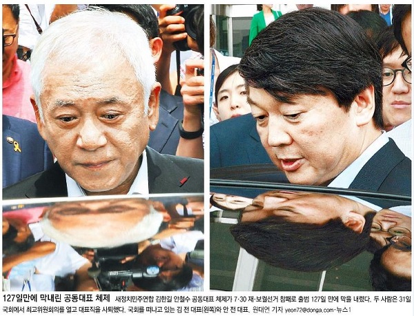동아일보도 “김한길·안철수 공동대표 체제가 7·30 재·보궐선거 참패로 출범 127일 만에 막을 내렸다”며 두 사람이 국회를 떠나고 있는 모습을 1면 사진으로 실었다.