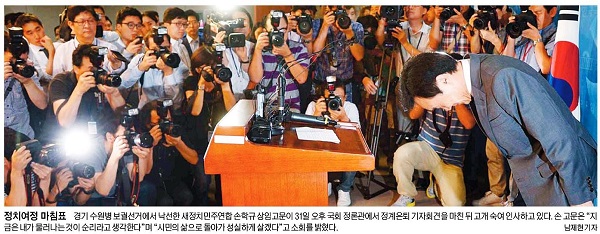 한겨레도 ‘정치인생 21년 종지부’라는 제목의 사진을 통해 손 상임고문이 선거 패배에 대한 책임을 지고 정계은퇴를 선언한 뒤 허리 숙여 인사하고 있는 모습을 보도했다.