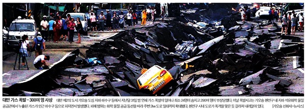 대만 가오슝(高雄)에서 1일(현지시간) 연쇄 가스 폭발사고가 발생해 최소 26명이 사망하고 290여명이 부상했다. 이날 사고는 가오슝 첸전구 지하 석유화학 물질(프로필렌) 공급관에서 누출된 가스가 인근 하수구 통로 등으로 퍼지며 발생했다. 조선일보, 중앙일보, 한겨레는 2일 1면 사진을 통해 사고의 참상을 전했다. 사진 속 현장은 함몰된 도로에 자동차들이 처박히고, 시민들이 이를 망연자실하게 바라보고 있는 모습이었다.