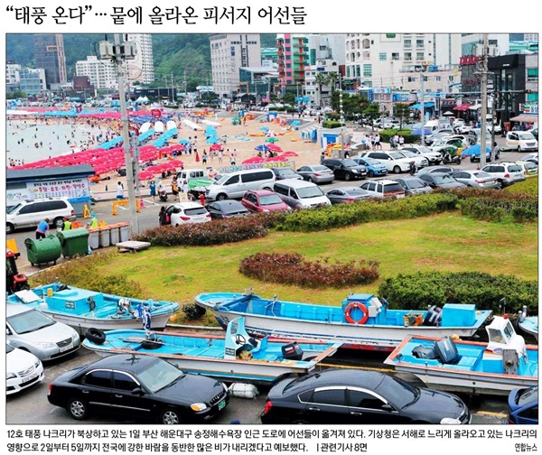 12호 태풍 나크리의 영향으로 2일부터 5일까지 전국에 강한 바람을 동반한 비가 예고된 가운데 경향은 인근 도로에 ‘대피’한 어선들을 1면 사진으로 보도했다. 경향은 “기상청은 태풍 나크리가 1일 오후 3시 현재 최대 풍속 초속 25m의 중형 크기를 유지하면서 서귀포 남쪽 510km 해상에서 시속 22km 속도로 북서진하고 있다고 밝혔다”며 “서해로 느리가 북상 중인 태풍의 영향으로 2~3일 제주도·남해안·지리산을 중심으로 시간당 40mm 이상의 많은 비가 내릴 것으로 예보됐다”고 밝혔다.