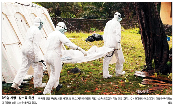 치명적인 에볼라 바이러스가 서아프리카 국가를 넘어 세계적인 재앙으로 번질 조짐을 보이고 있어 국제사회의 우려가 커지고 있다. 국민일보는 1면 사진에서 라이베리아 포야에서 에볼라 바이러스에 감염돼 숨진 시신을 옮기는 장면을 전하며 “치사율이 90%에 이르는 에볼라 바이러스가 서아프리카를 중심으로 계속 확산되면서 라이베리아 정부가 통제 수준을 넘어서 재앙이 임박했다고 경고했다. 바이러스 확산을 막기 위해 미국은 전문가 50명을 해당 지역에 보내기로 하고 자국민 대피를 위한 전세기도 급파했다”고 보도했다.