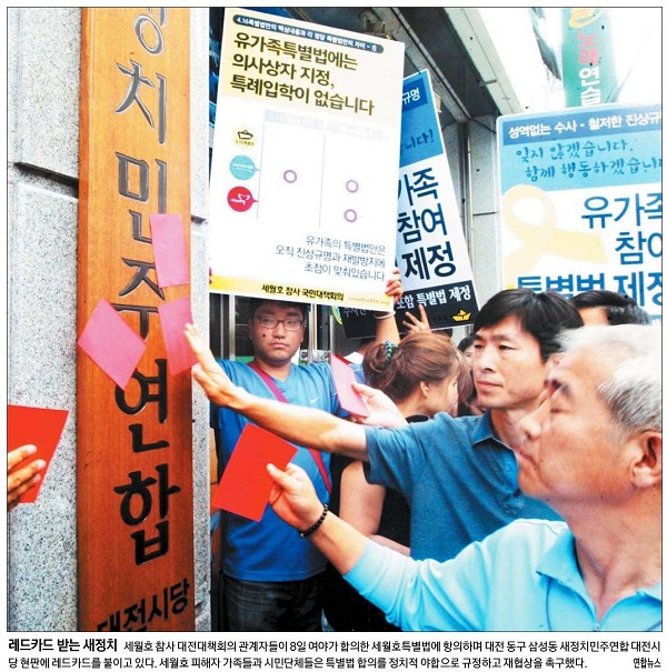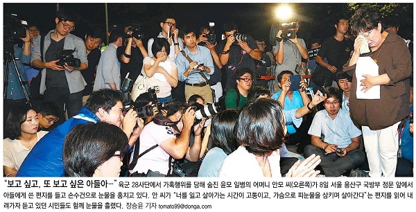 동아일보, 조선일보, 한겨레, 한국일보는 윤 모 일병의 어머니 안 모 씨가 8일 밤 서울 용산구 국방부 앞에서 열린 추모제에 참석해 아들에게 띄우는 편지를 읽는 모습을 1면 사진으로 보도했다.