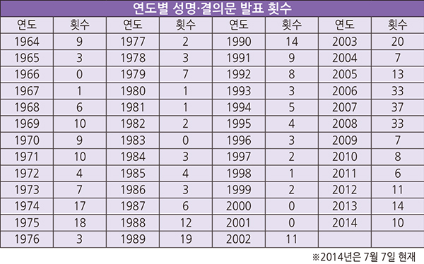 성명 등의 발표 횟수는 한 해 평균 8.42회로 나타났다. 가장 빈번하게 성명을 낸 해는 2007년으로 37회에 이르렀고 2006년과 2008년이 33회씩으로 뒤를 이었다. 반면에 1966년, 1983년, 2000년, 2001년에는 한 차례도 성명이나 결의문을 내지 않은 것으로 나타났다.
