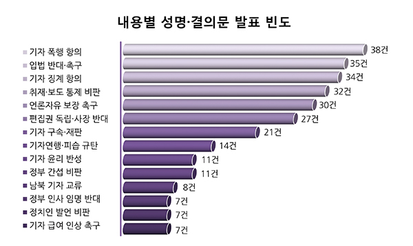 기자 윤리와 관련해 자정을 촉구하거나 언론의 보도 태도를 비판하는 성명은 각각 11건과 6건으로 집계됐다. 남북 기자 교류 촉구는 8건, 정치인의 언론 개입이나 폄훼 발언 비판은 7건, 정부 주요 인사 임명 반대는 7건이다.