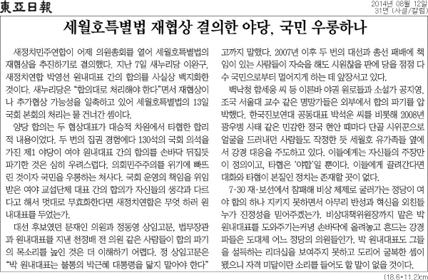 중앙일보도 14일 ‘야당은 7·30 민심 벌써 잊었나’란 제하의 사설에서 “7·30 민심은 세월호를 합리적으로 마무리하고 경제 살리기와 국가개조에 매진하라는 뜻”이라며 “합리적인 합의를 뒤엎는 ‘재협상 투쟁’이 과거 선거에서 어떤 결과를 가져왔는지 야당은 기억해야 한다”고 비판했다.