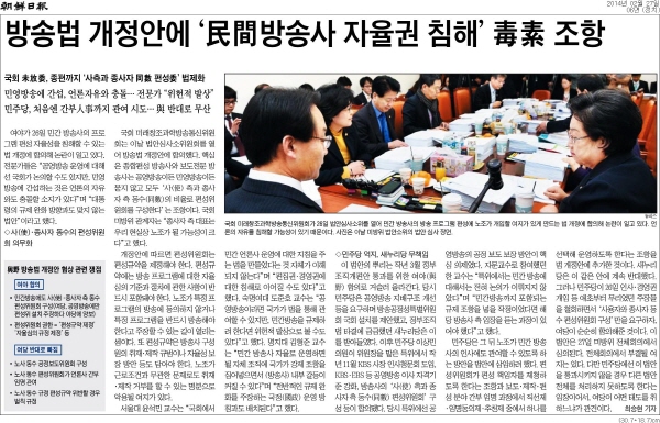 조선일보는 지난 2월27일 6면 기사에서 한선교 당시 미래창조과학방송통신위원장과 조해진 새누리당 미방위 간사, 유승희 새정치연합 미방위 간사, 방송법 개정안을 발의한 이상민 새정치연합 의원 등 4인방을 “방송법 개악 주역”이라고 비판했다.