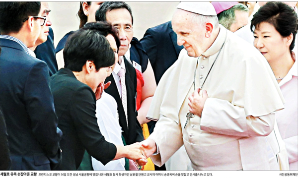 교황은 세월호 희생자 유가족에 대한 위로의 말을 전하기도 했다. 이에 대해 경향은 ‘평화는 정의의 결과… 세월호 가슴 아프다’를 1면 헤드라인으로 썼다. 한겨레도 “주교단 9명과 인사를 나눈 교황을 32명의 평신도가 영접했다. 그중엔 세월호 희생자인 고 남윤철 단원고 교사의 부친 남수현씨와 송경옥씨 부부 등 유족 4명이 있었다”며 “이들이 눈물을 흘리며 손을 잡자 교황은 왼손을 가슴에 얹고 슬픈 표정을 지어보이며 ‘마음 속에 깊이 간직하고 있다. 가슴이 아프다. 희생자들을 기억하고 있다’고 진심 어린 위로를 건넸다”고 보도했다.