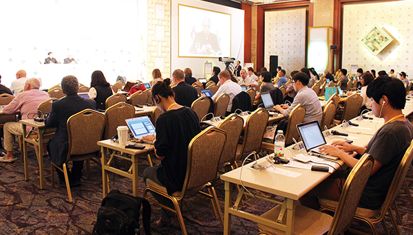 ▲ 지난 17일 서울 중구 소공동 롯데호텔 메인프레스센터(MPC)에서 내·외신 기자들이 교황청 대변인 페데리코 롬바르디 신부의 브리핑을 듣고 있다. |