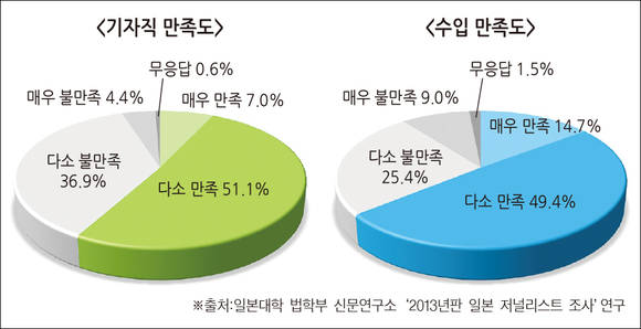 일본 기자들은 기자 활동과 수입에 대해 대체로 만족하는 것으로 나타났다. 일본대학 법학부 신문연구소에서 3월 발간한 ‘저널리즘&미디어’에 실린 ‘2013년 일본의 저널리스트 조사-일본 저널리즘의 현재’에 따르면, 기자 수입에 대해 만족한다는 답이 64.1%(매우 만족 14.7%, 다소 만족 49.4%), 불만족은 34.4%(다소 불만족 25.4%, 매우 불만족 9.0%)였다. 기자 활동에 대한 만족은 58.1%(매우 만족 7.0%, 다소 만족 51.1%), 불만족은 41.3%(다소 불만족 36.9%, 매우 불만족 4.4%)였다. 지난해 2~3월말 일본 신문ㆍ방송ㆍ통신사 등 현직 언론인을 대상으로 우편설문조사 한 결과 2200건 중 회수된 747건에 대한 통계다.
