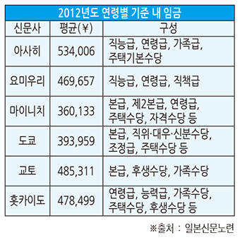 하지만 광고 수입 축소와 재정 악화 등으로 임금 인상이 없고 점차 저하되는 추세라 만족도가 낮아지고 있다는 지적도 있다. 다만 아사히가 40세에 연봉 1000~1200만엔(1억원 내외)으로 예외적이며, 지역신문은 45세에 700~1000만엔 정도라는 것. 일본신문노련이 조사한 ‘2012년도 연령별 기준 내 임금’ 월평균에서도 아사히는 53만4006엔(530만원)으로 가장 높았고, 요미우리는 46만9657엔, 마이니치는 36만133엔, 도쿄신문은 39만3959엔이었다. 지역신문인 교토신문은 48만5311엔, 홋카이도신문은 47만8499엔 등이었다.(각 사별 직능급ㆍ주택수당 등 포함, 잔업수당 불포함) 신문노련 코키 타나카 서기는 “최근 10~15년간 신문사 임금이 크게 변동하지 않았다. 지금도 2012년 수준으로 봐도 무방하다”며 “지역주민의 구독률이 높은 지역 주요 신문들은 안정적인 재정으로 전국지에 버금가지만 중소 규모의 지역신문사들은 어렵다. 치바일보나 사이타마신문 등 급여가 너무 낮아 공개하지 못한 곳도 있다”고 말했다.