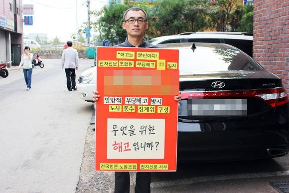 지난 15일 아침, 서울 영등포 전자신문 사옥 출입문 앞. 직장이탈 등의 사유로 해고 통보를 받은 이은용 기자가 피켓을 들었다. ‘무엇을 위한 해고입니까?’라는 피켓 문구만큼이나 그는 결연했다. “회사는 긴급히 해고해야 할 사유로 3가지를 들었는데 너무 빈약합니다. 명예회복을 위해 지방노동위원회에 구제신청을 할 예정입니다.”