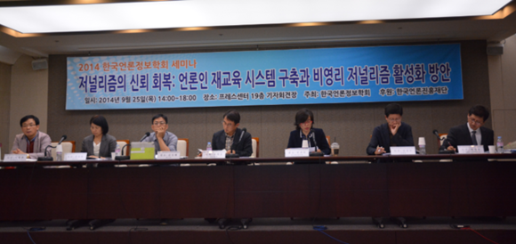 반면 김경희 한림대 교수는 “언론이 신뢰받지 못하는 이유가 지식이나 테크닉 등 전문성 부재때문이었나”라고 반문하며 “가장 중요한 것은 기자정신에 대한 교육”이라고 강조했다. 김 교수는 “과거에는 직업 자체에 대한 자존감이 있었는데 IMF를 기점으로 언론사 자체가 돈을 버는 ‘기업’이 됐다”며 “세월호 참사로 언론학계도 반성이 필요하다. 윤리 교육을 강화해야 ‘기자다움’ ‘언론다움’으로 나아갈 수 있다”고 지적했다.