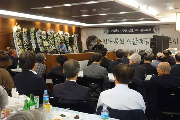 10일 오후 7시 서울 연세대 세브란스병원 장례식장에 마련된 성유보 전 동아자유언론수호투쟁위원회(동아투위) 위원장의 빈소. 언론계, 시민사회 인사 250여명이 자리한 가운데 고인의 마지막 가는 길을 배웅하는 ‘추모의 밤’이 열렸다.
