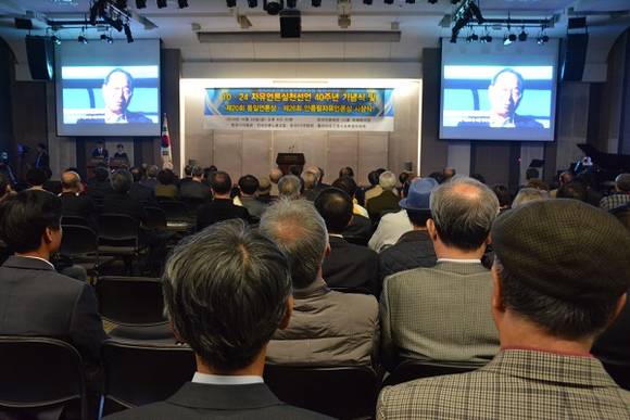 이날 서울 중구 프레스센터 20층 국제회의장에서는 자유언론실천선언의 의미를 되새기기 위해 한국기자협회와 전국언론노동조합, 한국PD연합회, 동아자유언론수호투쟁위원회(동아투위) 주최로 ‘10·24 자유언론실천선언 40주년 기념식’이 열렸다. 동아투위 위원들과 후배 기자들은 이 자리에서 자유언론실천선언의 의미가 아직도 유효하다고 밝히며 그 정신을 이어가겠다고 다짐했다.
