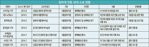 특히 청와대 대통령비서실은 세월호 참사 이후 관련 보도에 집중적으로 소송을 제기했다. CBS는 박 대통령의 세월호 희생자 조문 연출 의혹 보도로 정정보도 및 손해배상 소송을 당해 11월 중 공판이 시작된다. 한겨레신문도 박 대통령이 진도체육관을 방문했을 당시 참사 현장에서 구조된 아이를 위로하는 장면을 두고 ‘연출 의혹’을 제기한 네티즌 반응을 기사화했다. 이에 대통령비서실이 정정보도 소송을 제기해 다음달 5일 선고기일을 앞두고 있다. 동아일보의 한 기자는 김기춘 청와대 비서실장이 법무부 장관 시절 ‘오대양 사건’의 재수사를 방해했다는 의혹을 제기한 전 부산고검장의 발언을 보도했다가 민·형사 소송을 당했다.