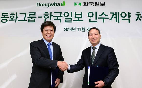 한국일보는 이날 서울 중구 남대문로 한국일보사에서 고낙현 한국일보 대표(법정 관리인), 이준희 한국일보 사장과 승명호 동화그룹 회장, 김홍진 동화기업 대표, 정대원 동화엠파크 대표 등이 참석한 가운데 한국일보 인수를 위한 투자계약 체결식을 가졌다고 밝혔다. 한국일보는 “본계약 체결에 따라 동화그룹이 지급할 인수 대금은 한국일보사의 회생‧공익 채무 변제에 우선적으로 쓰이게 된다”고 설명했다.