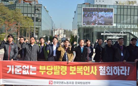앞서 전국언론노조 MBC본부도 낮 12시에 기자회견을 열고 ‘밀실 보복 인사’에 대해 비판했다. 김한광 MBC본부 수석부위원장은 “안광한 사장 체제에서 지금 벌어지고 있는 일들은 철저한 인사 보복과 전횡 등으로 MBC를 망가뜨린 김재철 전 사장 판박이”라며 “양심 있는 언론인들에 칼날을 휘둘렀던 김재철 사장이 사회로부터 격리되듯 안 사장도 그 길을 가겠다고 벼르고 있는 것 같다. 안 사장에 엄중히 충고한다. 당장 MBC를 제자리로 돌려놔라”고 말했다.