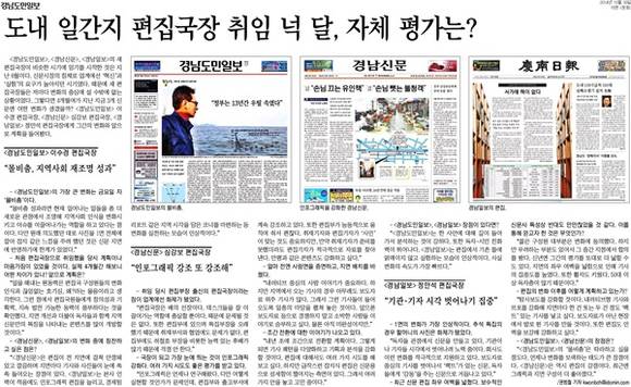 경남도민일보, 경남신문, 경남일보 편집국장들이 취임 4개월여 간의 ‘변화’에 대해 입을 뗐다. 경남도민일보는 지난달 30일자 신문에 ‘도내 일간지 편집국장 취임 넉 달, 자체 평가는?’ 기사를 통해 지난 6월 비슷한 시기에 취임한 경남도민일보 이수경 편집국장, 경남신문 심강보 편집국장, 경남일보 정만석 편집국장의 인터뷰를 실었다. 이들 신문은 ‘편집’을 강화하며 ‘독자 친화적’인 변화를 모색하고 있다. 편집국장들은 “보도자료 중심의 기사를 벗어나” “지역 독자들에게 ‘감동’을 주겠다”고 밝혔다.