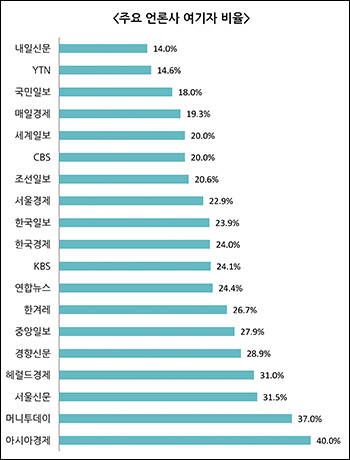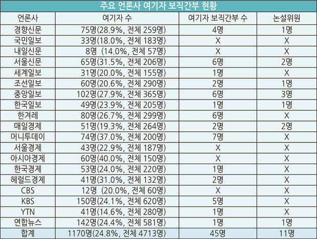 본보가 경향신문 국민일보 내일신문 서울신문 세계일보 조선일보 중앙일보 한국일보 한겨레 매일경제 머니투데이 서울경제 아시아경제 한국경제 헤럴드경제 CBS KBS YTN 연합뉴스 등 19개 언론사를 조사한 결과, 11월 현재 보직간부를 맡고 있는 여기자는 총 45명인 것으로 나타났다. 평균 2.3명 수준으로 여성 보직간부가 없는 언론사는 5곳에 달했다. 논설위원의 경우에도 평균 0.5명으로 12개 언론사에는 아예 여성 논설위원이 없었다. 특히 국민일보를 비롯해 내일신문, 서울경제, 아시아경제에는 부장급 이상 여기자가 단 한 명도 없는 것으로 나타났다.