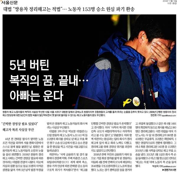 서울신문도 ‘5년 버틴 복직의 꿈, 끝내… 아빠는 운다’ 기사에서 “44년 전 전태일 열사가 열악한 노동 조건 개선을 외치며 서울 평화시장에서 스스로 몸에 불을 붙였던 날. 법원은 쌍용자동차 해고 노동자들의 소망과 눈물을 끝내 외면했다”며 “자살과 질환 등으로 동료 25명의 아까운 생명을 잃어 가며 5년 넘게 법정 투쟁을 벌여 온 쌍용차 해고 노동자들의 회사 복귀는 사실상 무산됐다”고 밝혔다. 고법서 판단이 뒤집어질 가능성은 희박하다고 덧붙였다.