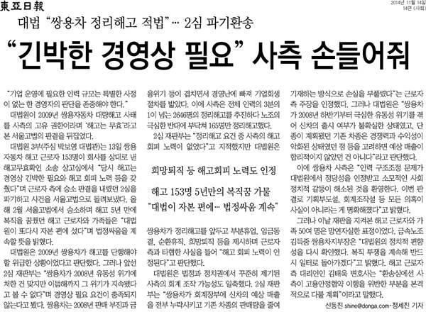 동아일보는 “대법원이 2009년 쌍용자동차 대량해고 사태를 사측의 고유 권한이라며 ‘해고는 무효’라고 본 서울고법의 판결을 뒤집었다”며 2심에 대한 대법원 판결 내용을 비교했다. 동아는 “대법원은 쌍용차가 해고를 단행해야 할 위급한 상황이었다고 판단했다”며 “법정과 정치권에서 꾸준히 제기된 사측의 회계 조작 가능성도 일축했다”고 밝혔다. 해고 근로자와 가족 50여명은 망연자실한 표정이었다고 밝혔다.