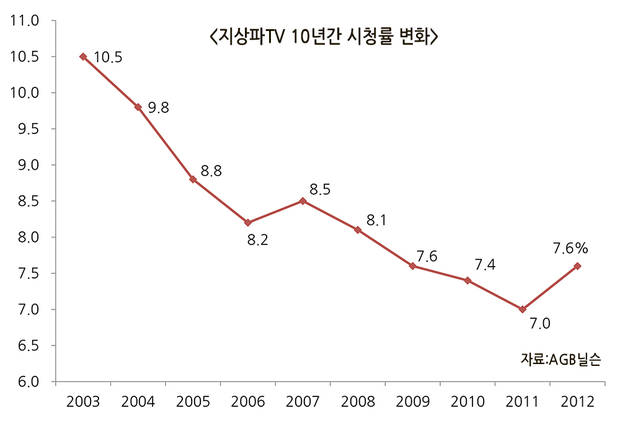지상파의 위기를 보여주는 통계는 많이 나와 있다. 대표적인 것이 광고 매출이다. 2011년을 기점으로 하락 추세인 지상파 TV광고 매출은 2012년 처음 인터넷에 1위 자리를 내준 이래 재역전 기미가 보이지 않는다. 한국방송광고진흥공사에 따르면 지난해 국내 전체 광고시장은 2012년 대비 2.9% 성장했는데 지상파는 3.2% 감소했다.