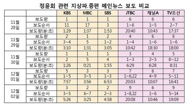 5일 동안 KBS는 12건을 19분28초, MBC는 8건을 10분50초, SBS는 9건을 18분44초 보도해 3사 총합은 29건 49분2초로 나타났다. 이에 비해 TV조선은 33건을 1시간19분51초, 채널A는 28건을 56분34초, JTBC는 29건을 1시간18분2초 동안 보도해 총 90건 3시간34분27초로 집계됐다. 종편이 지상파보다 보도량으로는 3배, 시간상으로는 4배 더 많이 보도한 것이다.