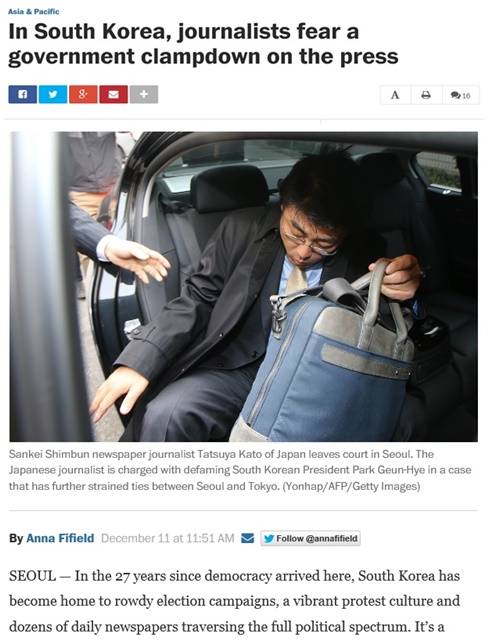 미국 워싱턴포스트(WP)가 박근혜 정부 들어 위축되고 있는 한국의 언론 자유를 지적하는 기사를 실어 주목받고 있다.