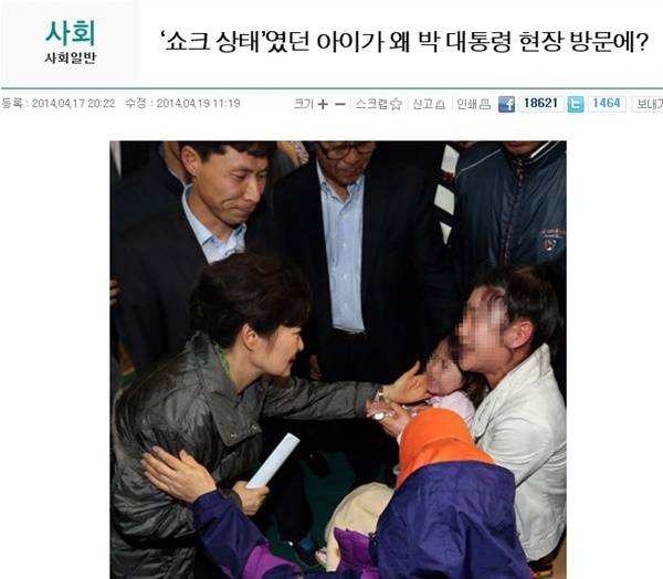한겨레는 박근혜 대통령이 세월호 사고 발생 다음날인 4월17일 진도체육관을 방문해 가족을 잃고 홀로 구조된 5살 난 권모양을 위로하는 모습을 두고 SNS에서 논란이 일고 있다며 반응 등을 인용해 ‘쇼크 상태였던 아이가 왜 박 대통령 현장 방문에?’라는 제목의 온라인 기사를 보도했다.