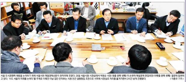 이 자리에는 박원순 시장을 비롯해 경제진흥실, 도시계획국 등 서울시 주요 실‧국장 15명과 매경 손현덕 편집국장 등 주요 보직 부장 등 13명이 참석했다.