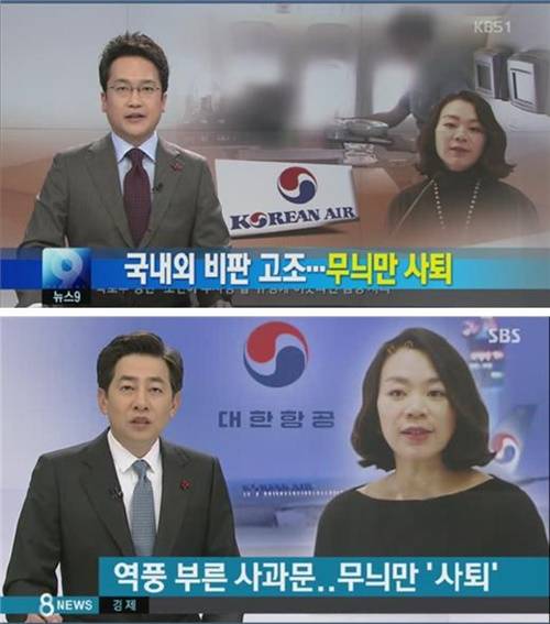 사회적으로 파장이 커지자 조현아 전 부사장은 9일 부사장 보직에서 사퇴했다. 하지만 계열사 보직은 유지한 상태였다. KBS와 SBS는 메인뉴스에서 자막과 앵커멘트, 기사문장 등을 통해 ‘부사장 직함과 등기이사 자리는 유지하고 한진관광과 칼 호텔 등 계열사 대표이사직은 계속 맡기로 해 ’무늬만 사퇴‘라는 지적이 나오고 있다’고 보도했다. 또 CNN과 BBC 등 해외 언론의 비판적인 보도도 추가했다. 민실위보고서는 “같은날 MBC뉴스데스크는 달랐다”며 “뉴스데스크에는 ‘무늬만 사퇴’라든지 해외 언론의 비판 내용 등은 들어가지 않았고, ‘사무장 없이 운항해도 된다’는 교신 내용, ‘임원들은 기내 서비스 점검 의무가 있고 지적도 당연하다’는 대한항공 측 입장 등이 삽입됐다”고 밝혔다.
