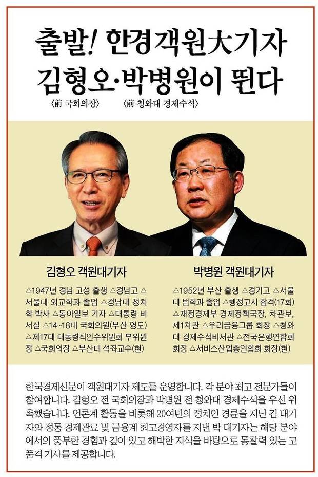 한경도 5일 김형오 전 국회의장과 박병원 전 청와대 경제수석을 객원대기자로 위촉한 데 이어 향후 객원대기자 수를 늘려나갈 방침이다.