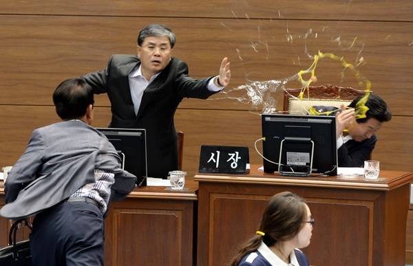 ‘계란 맞은 안상수 창원시장’은 지난해 9월 경남 창원시의회 본회의장에서 진해구 출신 김성일 시의원이 프로야구 NC 다이노스 새 야구장 입지 변경에 항의하며 안상수 창원시장에게 계란을 던지는 순간을 포착한 사진이다.