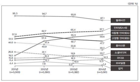 뉴스 이용률은 모바일(2013년 55.3%→2014년 59.6%), 소셜미디어(2013년 19.9%→2014년 20.7%), 모바일앱(2013년 10.4%→2014년 12.5%)에선 증가한 반면, 텔레비전 뉴스(2013년 93.8%→2014년 87.1%), 종이신문(2013년 33.8%→2014년 30.7%) 등은 하락한 것으로 나타났다.