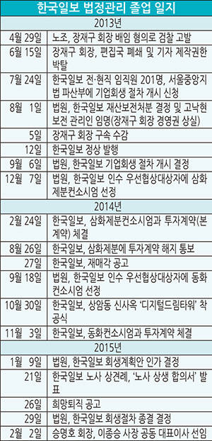 법정관리 공식 종료를 사흘 앞둔 지난달 26일, 한국일보는 ‘경영정상화 계획에 따른 희망퇴직 실시’를 공고했다. 새 경영진과 노조가 고용 보장 등을 명시한 ‘노사 상생 합의서’에 서명한지 닷새 만의 일이었다. 노조는 “노사가 서로 화합하고 상생해 나아가야 할 출발 시점에 나온 경영진의 첫 결정이 희망퇴직 공고”라며 즉각 우려를 표명했지만, 경영진은 그대로 밀어붙였고 연장공고까지 냈다.