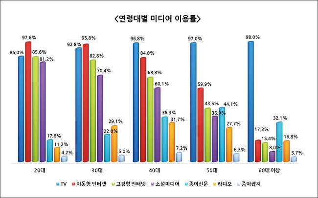 하지만 연령대별로 보면 30대의 이동형 인터넷(모바일) 이용률은 95.8%로 조사 이래 처음 TV 이용률(92.8%)을 앞질렀다. 20대의 경우 2012년부터 이동형 인터넷 이용률이 TV 이용률을 제쳤다. 20~30대 젊은 층을 중심으로 미디어 소비가 전통매체에서 모바일 등 이동형 인터넷으로 빠르게 이동하고 있음을 보여주고 있다.