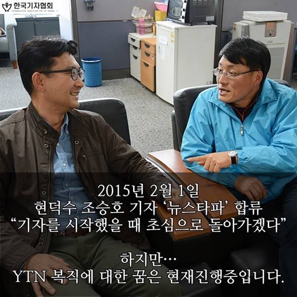 2008년 YTN에서 해직된 조승호, 현덕수 기자가 2월 1일 비영리독립언론 ‘뉴스타파’에 출근했습니다. 6년 4개월 만에 취재현장으로 돌아간 두 기자에게 응원을 보냅니다. 사실 이들은 YTN 복직만을 염원하며 타 언론사에 몸담는 것을 생각하지도 못했습니다. 하지만 지난해 11월 27일 대법원이 6명의 해직기자 중 노종면, 조승호, 현덕수 기자의 해고를 인정하면서 복직이 좌절됐습니다. 아직 YTN 해직사태는 끝나지 않았습니다.