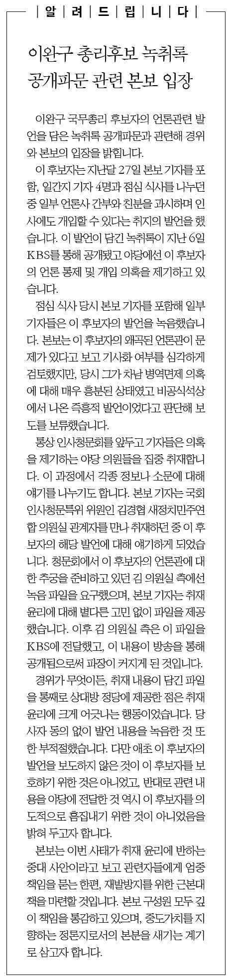한국일보는 이날 1면 ‘알려드립니다’를 통해 “점심 식사 당시 본보 기자를 포함해 일부 기자들은 이 후보자의 발언을 녹음했다”며 “본보는 이 후보자의 왜곡된 언론관이 문제가 있다고 보고 기사화 여부를 심각하게 검토했지만, 당시 그가 차남 병역면제 의혹에 대해 매우 흥분한 상태였고 비공식석상에서 나온 즉흥적 발언이었다고 판단해 보도를 보류했다”고 밝혔다.