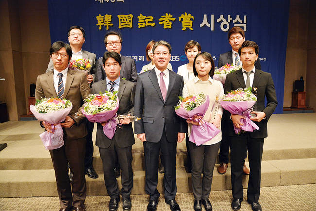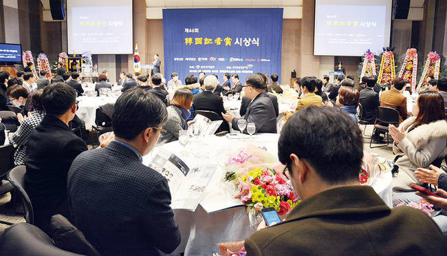 10일 열린 제46회 한국기자상 시상식은 수상자를 축하하기 위해 모인 가족과 동료들로 북적였다. 특히 수상자 가족들은 그간의 고생에 안쓰러워하면서도 누구보다 큰 박수를 보냈다.