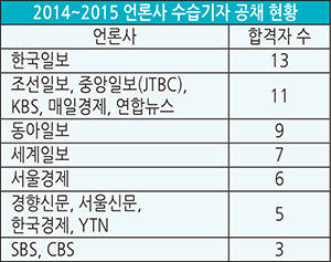 지난해 언론사들은 적게는 3명에서 많게는 13명까지 수습기자(취재기자 기준)를 채용했다. 2013년 견습기자를 뽑지 않은 한국일보가 지난해 13명을 채용해 가장 높은 수를 기록했고 조선일보·중앙일보(JTBC 통합)·KBS·매일경제·연합뉴스가 11명을 선발했다. 이어 동아일보 9명, 세계일보 7명, 서울경제 6명, 경향신문·서울신문·한국경제·YTN이 5명, SBS와 CBS는 3명을 채용했다. 현재 전형을 진행 중인 곳은 국민일보 등이다.