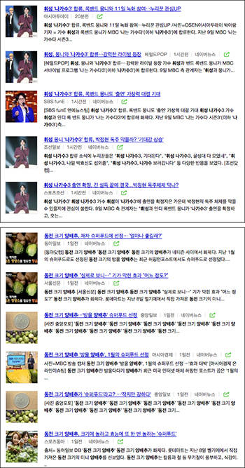 여기에 그치지 않고 클러스터링(묶음기사) 상단에 위치하기 위해 보도 자료를 여러 각도로 기사화하는 ‘꼼수’도 동원되고 있다. 10일 네이버 뉴스에는 가수 휘성이 MBC ‘나가수3’에 출연한다는 기사가 ‘저조한 시청률 구세주 되나’, ‘박정현-양파-소찬휘 떨고 있나’, ‘휘성 ‘나가수3’합류’, ‘휘성 나가수3 합류, SES 백댄서 출신?’ 등으로 나누어 보도됐다.